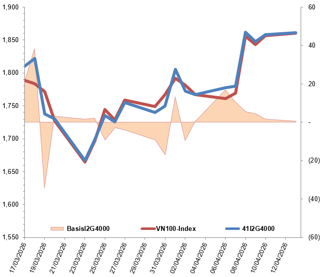 Ngoài ra, các hợp đồng tương lai VN100 hầu hết đều tăng trong phiên giao dịch ngày 13/04/2026. Cụ thể, 41I2G4000 (I2G4000) tăng 0.15%, đạt 1,861 điểm; 41I2G5000 (I2G5000) giảm 0.11%, còn 1,864 điểm; hợp đồng 41I2G6000 (I2G6000) tăng 0.1%, đạt 1,853.9 điểm; hợp đồng 41I2G9000 (I2G9000) tăng 0.15%, đạt 1,858 điểm. Chỉ số cơ sở VN100-Index kết phiên ở mức 1,860.33 điểm.
