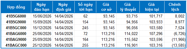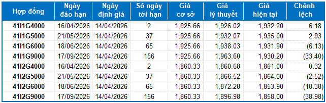 Dựa trên phương pháp định giá hợp lý với thời điểm khởi đầu ngày 14/04/2026, khung giá hợp lý của các hợp đồng tương lai đang được giao dịch trên thị trường được thể hiện như sau: