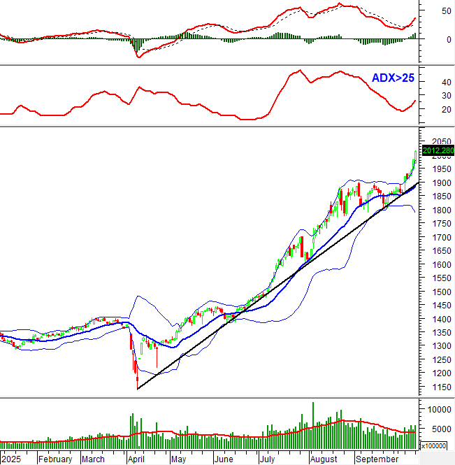 Hiện tại, chỉ số ADX tiếp tục tăng và đã vượt lên khỏi vùng xám (20<ADX<25) trong khi chỉ số tiếp tục bám sát dải trên (Upper Band) của Bollinger Bands và lập đỉnh cao mới. Điều này cho thấy xu hướng đã mạnh hơn và triển vọng tích cực tiếp tục duy trì.