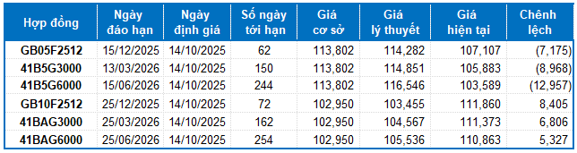Dựa trên phương pháp định giá hợp lý với thời điểm khởi đầu ngày 14/10/2025, khung giá hợp lý của các hợp đồng tương lai đang được giao dịch trên thị trường được thể hiện như sau: