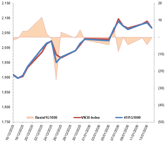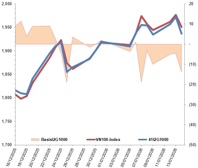 Trong phiên giao dịch ngày 14/01/2026, hợp đồng 41I1G1000 sớm rơi vào trạng thái giằng co kéo dài quanh mốc tham chiếu trong phần lớn thời gian và phe Short bất ngờ chiếm ưu thế vào cuối phiên sáng khiến I1G1000 giảm điểm. Bước sang phiên chiều, áp lực bán ngày càng gia tăng khiến hợp đồng này lao dốc không phanh mặc cho bên mua xuất hiện trở lại nhưng vẫn không thể thu hẹp đà giảm cuối phiên. Qua đó, I1G1000 đóng cửa trong sắc đỏ với mức giảm 18 điểm.