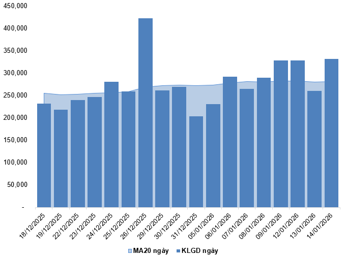 Trong phiên giao dịch ngày 14/01/2026, VN30-Index giảm điểm kèm theo khối lượng giao dịch vượt mức trung bình 20 phiên cho thấy tâm lý không mấy lạc quan của nhà đầu tư.