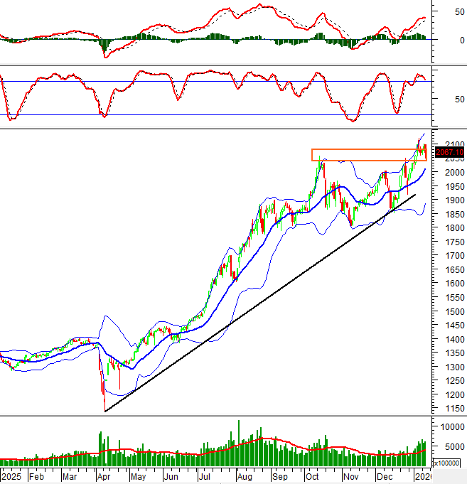 Hiện tại, chỉ số tiếp tục kiểm tra lại đỉnh cũ tháng 10/2025 (tương đương vùng 2,035-2,080 điểm) đã bị phá vỡ trước đó trong bối cảnh chỉ báo Stochastic Oscillator đã cho tín hiệu bán trong vùng quá mua (Overbought).
