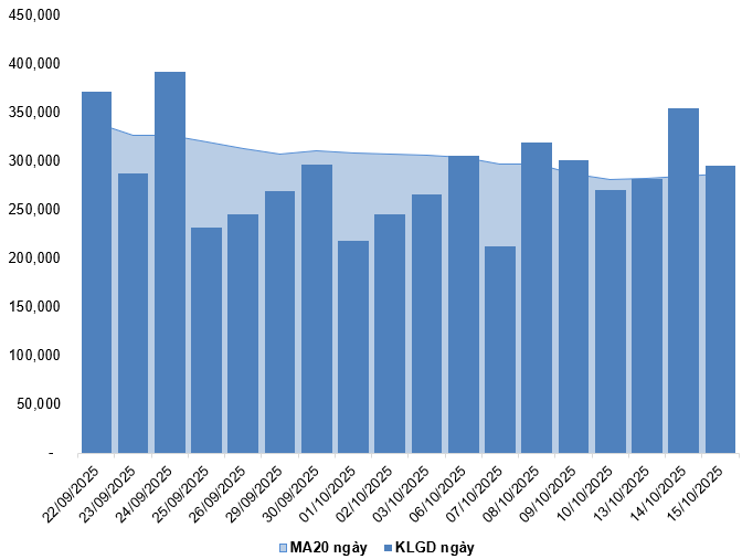 Trong phiên giao dịch ngày 15/10/2025, VN30-Index giảm nhẹ đồng thời xuất hiện mẫu hình nến thân nhỏ kèm theo khối lượng giao dịch vượt mức trung bình 20 phiên cho thấy tâm lý khá phân vân của nhà đầu tư vẫn hiện hữu.