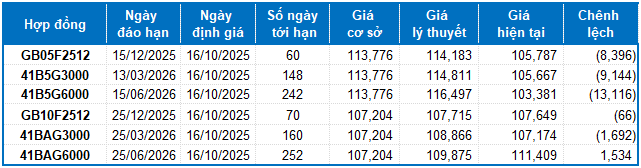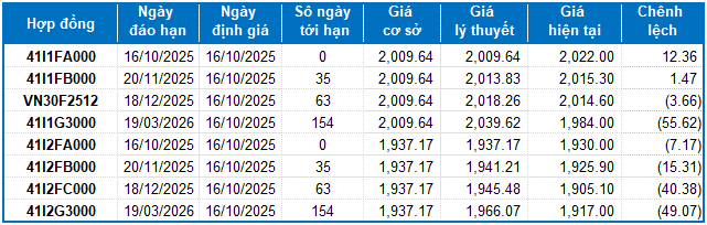 Dựa trên phương pháp định giá hợp lý với thời điểm khởi đầu ngày 16/10/2025, khung giá hợp lý của các hợp đồng tương lai đang được giao dịch trên thị trường được thể hiện như sau: