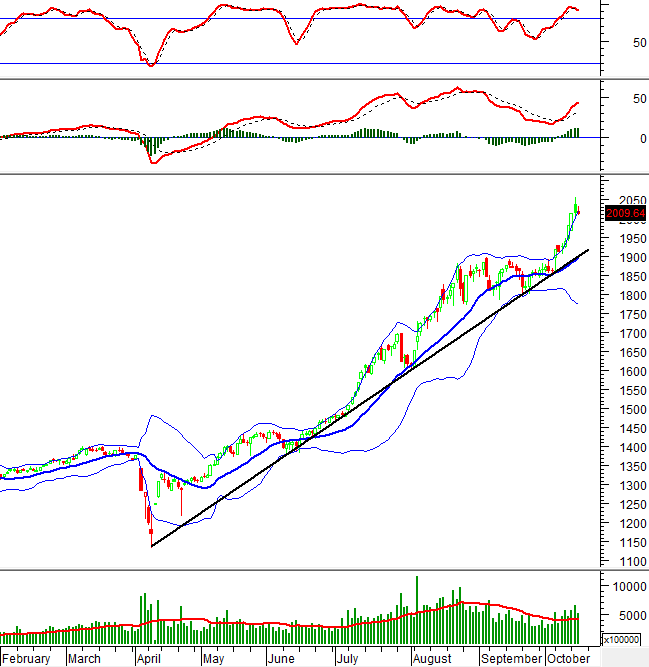 Hiện tại, chỉ số vẫn bám sát Upper Band của Bollinger Bands trong khi chỉ báo MACD vẫn tiếp tục tăng sau khi cho tín hiệu mua. Điều này cho thấy xu hướng tăng trung hạn vẫn còn.
