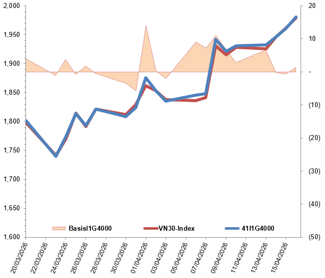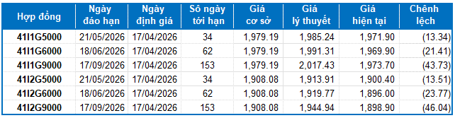 Các hợp đồng tương lai VN30 đồng loạt tăng điểm trong phiên giao dịch ngày 16/04/2026. Cụ thể, 41I1G4000 (I1G4000) tăng 0.99%, đạt 1,980.5 điểm; 41I1G5000 (I1G5000) tăng 0.76%, đạt 1,971.9 điểm; hợp đồng 41I1G6000 (I1G6000) tăng 0.67%, đạt 1,969.9 điểm; hợp đồng 41I1G9000 (I1G9000) tăng 0.78%, đạt 1,973.7 điểm. Chỉ số cơ sở VN30-Index kết phiên ở mức 1,979.19 điểm.