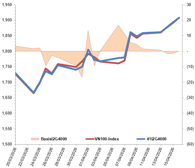 Ngoài ra, các hợp đồng tương lai VN100 đồng loạt tăng điểm trong phiên giao dịch ngày 16/04/2026. Cụ thể, 41I2G4000 (I2G4000) tăng 0.92%, đạt 1,908 điểm; 41I2G5000 (I2G5000) tăng 0.28%, đạt 1,900.4 điểm; hợp đồng 41I2G6000 (I2G6000) tăng 0.12%, đạt 1,896 điểm; hợp đồng 41I2G9000 (I2G9000) tăng 0.63%, đạt 1,898.9 điểm. Chỉ số cơ sở VN100-Index kết phiên ở mức 1,908.08 điểm.