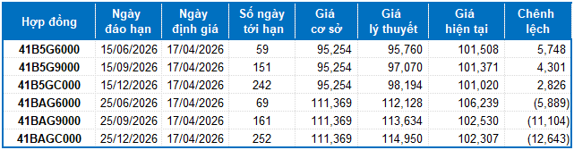 Dựa trên phương pháp định giá hợp lý với thời điểm khởi đầu ngày 17/04/2026, khung giá hợp lý của các hợp đồng tương lai đang được giao dịch trên thị trường được thể hiện như sau: