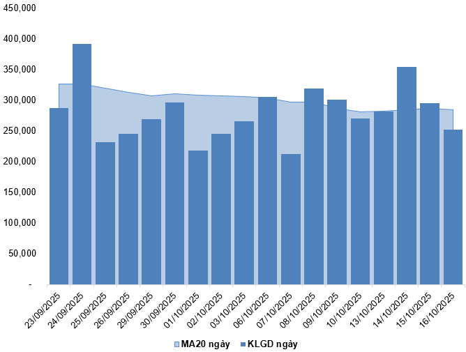 Trong phiên giao dịch ngày 16/10/2025, VN30-Index tăng nhẹ đồng thời xuất hiện mẫu hình nến thân nhỏ kèm theo khối lượng sụt giảm và nằm dưới mức trung bình 20 phiên cho thấy tâm lý nhà đầu tư vẫn còn phân vân.