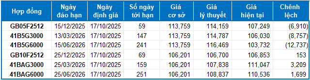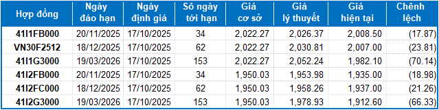Dựa trên phương pháp định giá hợp lý với thời điểm khởi đầu ngày 17/10/2025, khung giá hợp lý của các hợp đồng tương lai đang được giao dịch trên thị trường được thể hiện như sau: