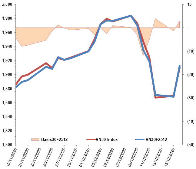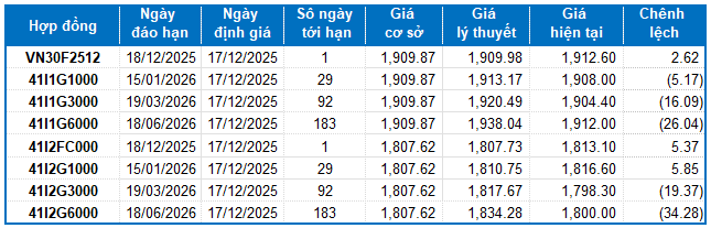 Các hợp đồng tương lai VN30 đồng loạt tăng điểm trong phiên giao dịch ngày 16/12/2025. Cụ thể, VN30F2512 (F2512) tăng 2.36%, đạt 1,912.6 điểm; 41I1G1000 (I1G1000) tăng 2.2%, đạt 1,908 điểm; hợp đồng 41I1G3000 (I1G3000) tăng 2.22%, đạt 1,904.4 điểm; hợp đồng 41I1G6000 (I1G6000) tăng 2.88%, đạt 1,912 điểm. Chỉ số cơ sở VN30-Index kết phiên ở mức 1,909.87 điểm.