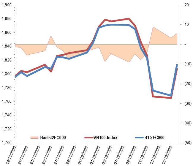 Ngoài ra, các hợp đồng tương lai VN100 đồng loạt tăng điểm trong phiên giao dịch ngày 16/12/2025. Cụ thể, 41I2FC000 (I2FC000) tăng 2.53%, đạt 1,813.1 điểm; 41I2G1000 (I2G1000) tăng 2.18%, đạt 1,816.6 điểm; hợp đồng 41I2G3000 (I2G3000) tăng 1.74%, đạt 1,798.3 điểm; hợp đồng 41I2G6000 (I2G6000) tăng 2.72%, đạt 1,800 điểm. Chỉ số cơ sở VN100-Index kết phiên ở mức 1,807.62 điểm.