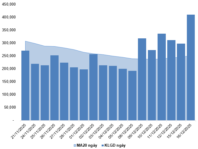 Trong phiên giao dịch ngày 16/12/2025, VN30-Index tiếp tục tăng điểm đồng thời xuất hiện mẫu hình nến Big White Candle kèm theo khối lượng giao dịch vượt mức trung bình 20 phiên cho thấy tâm lý đã bớt bi quan của nhà đầu tư.