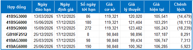 Dựa trên phương pháp định giá hợp lý với thời điểm khởi đầu ngày 17/12/2025, khung giá hợp lý của các hợp đồng tương lai đang được giao dịch trên thị trường được thể hiện như sau: