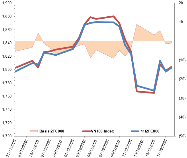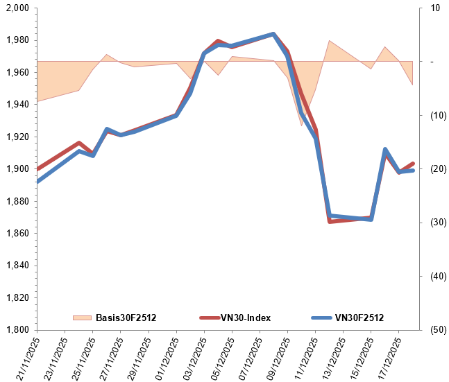 Khối lượng và giá trị giao dịch của thị trường phái sinh lần lượt giảm 11.29% và 11.96% so với phiên ngày 17/12/2025. Cụ thể, khối lượng giao dịch F2512 giảm 18.08% với 206,147 hợp đồng được khớp lệnh. Khối lượng giao dịch của I2FC000 đạt 26 hợp đồng, tăng 52.94%.