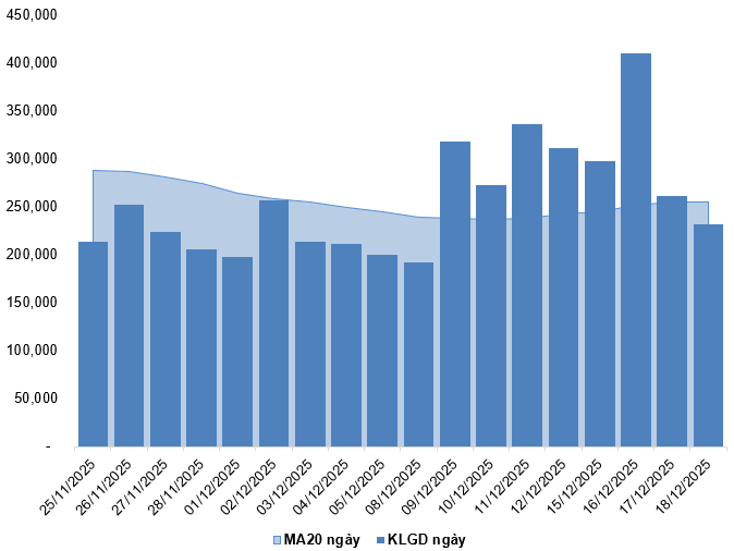 Trong phiên giao dịch ngày 18/12/2025, VN30-Index diễn biến giằng co đồng thời xuất hiện mẫu hình nến thân nhỏ kèm theo khối lượng giao dịch có sự trồi sụt thất thường trong các phiên gần đây cho thấy tâm lý thiếu ổn định của nhà đầu tư.