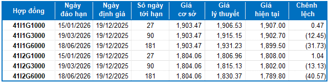 Dựa trên phương pháp định giá hợp lý với thời điểm khởi đầu ngày 19/12/2025, khung giá hợp lý của các hợp đồng tương lai đang được giao dịch trên thị trường được thể hiện như sau: