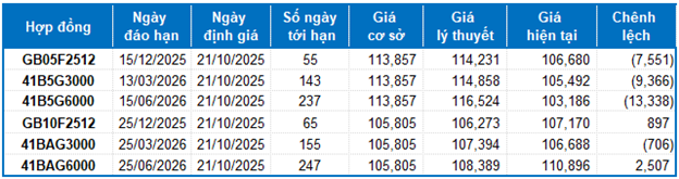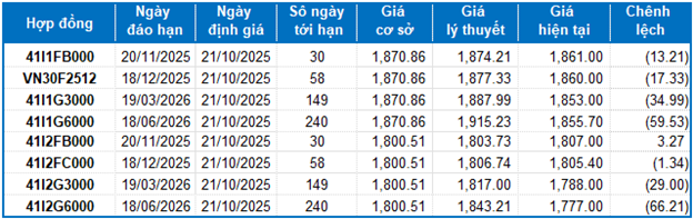 Dựa trên phương pháp định giá hợp lý với thời điểm khởi đầu ngày 21/10/2025, khung giá hợp lý của các hợp đồng tương lai đang được giao dịch trên thị trường được thể hiện như sau: