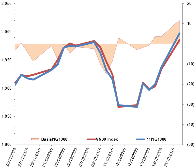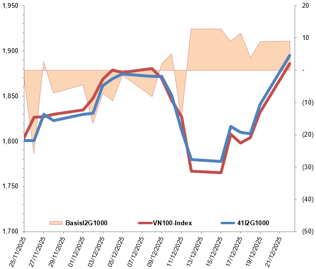 Trong phiên giao dịch ngày 22/12/2025, hợp đồng 41I1G1000 sớm bật tăng và diễn biến giằng co với lợi thế nghiêng về bên mua trong nửa đầu phiên và phe Long dần áp đảo giúp cho hợp đồng bứt phá mạnh mẽ trong thời gian còn lại của phiên sáng. Bước sang phiên chiều, tuy áp lực bán có xuất hiện trở lại nhưng bên mua vẫn chiếm ưu thế hơn đến hết phiên giúp I1G1000 đóng cửa trong sắc xanh với mức tăng hơn 60 điểm.
