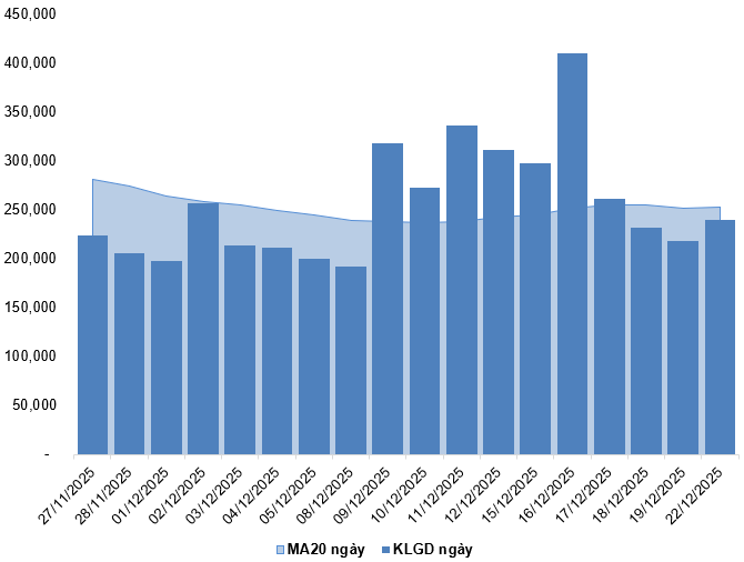 Trong phiên giao dịch ngày 22/12/2025, VN30-Index tăng điểm phiên thứ 3 liên tiếp đồng thời xuất hiện mẫu hình nến Three White Soldiers theo khối lượng liên tục gia tăng và vượt mức trung bình 20 phiên cho thấy tâm lý lạc quan của nhà đầu tư.