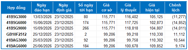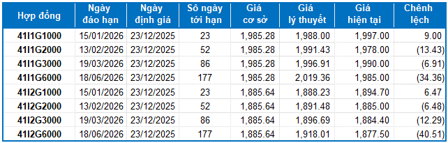 Dựa trên phương pháp định giá hợp lý với thời điểm khởi đầu ngày 23/12/2025, khung giá hợp lý của các hợp đồng tương lai đang được giao dịch trên thị trường được thể hiện như sau: