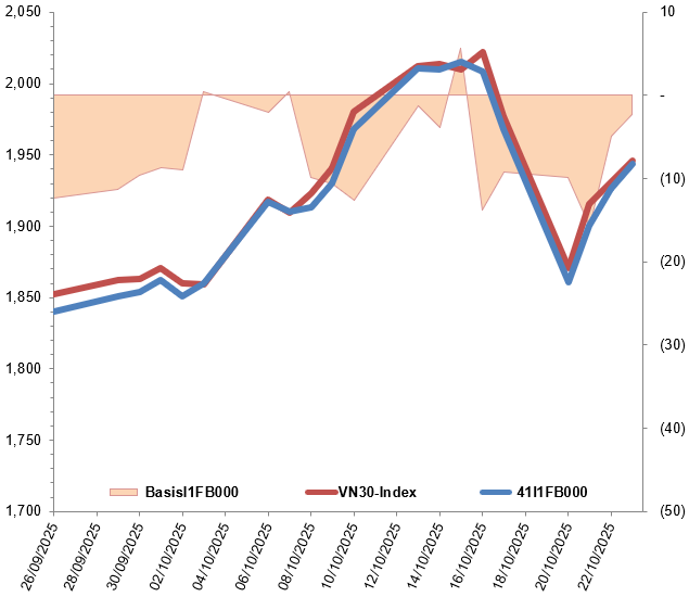 Kết phiên, basis hợp đồng 41I1FB000 thu hẹp so với phiên trước đó và đạt giá trị -2.28 điểm. Điều này cho thấy tâm lý nhà đầu tư đã bớt bi quan.