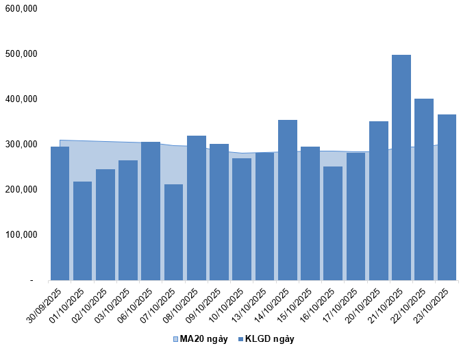 Trong phiên giao dịch ngày 23/10/2025, VN30-Index tăng điểm nhẹ đồng thời xuất hiện mẫu hình nến Spinning Top kèm theo khối lượng giao dịch tiếp tục sụt giảm và nằm dưới mức trung bình 20 phiên cho thấy tâm lý khá phân vân của nhà đầu tư.
