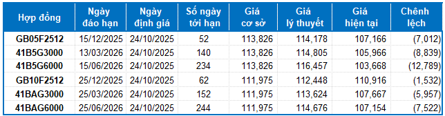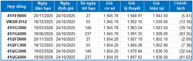 Dựa trên phương pháp định giá hợp lý với thời điểm khởi đầu ngày 24/10/2025, khung giá hợp lý của các hợp đồng tương lai đang được giao dịch trên thị trường được thể hiện như sau: