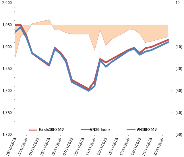 Khối lượng và giá trị giao dịch của thị trường phái sinh lần lượt giảm 18.92% và 17.15% so với phiên ngày 21/11/2025. Cụ thể, khối lượng giao dịch F2512 giảm 18.18% với 218,450 hợp đồng được khớp lệnh. Khối lượng giao dịch của I2FC000 còn 166 hợp đồng, giảm 93.52%.