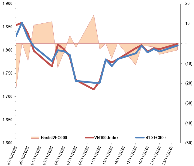 Ngoài ra, các hợp đồng tương lai VN100 đồng loạt tăng điểm trong phiên giao dịch ngày 24/11/2025. Cụ thể, 41I2FC000 (I2FC000) tăng 0.72%, đạt 1,810 điểm; 41I2G1000 (I2G1000) tăng 0.51%, đạt 1,808.1 điểm; hợp đồng 41I2G3000 (I2G3000) tăng 2.18%, đạt 1,806 điểm; hợp đồng 41I2G6000 (I2G6000) tăng 1.74%, đạt 1,798 điểm. Chỉ số cơ sở VN100-Index kết phiên ở mức 1,813.34 điểm.