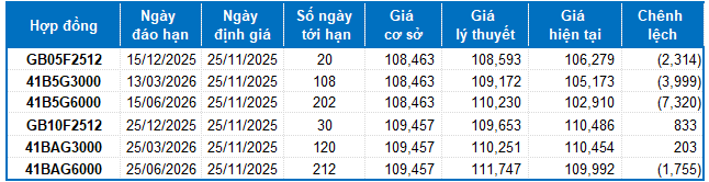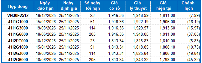 Dựa trên phương pháp định giá hợp lý với thời điểm khởi đầu ngày 25/11/2025, khung giá hợp lý của các hợp đồng tương lai đang được giao dịch trên thị trường được thể hiện như sau:
