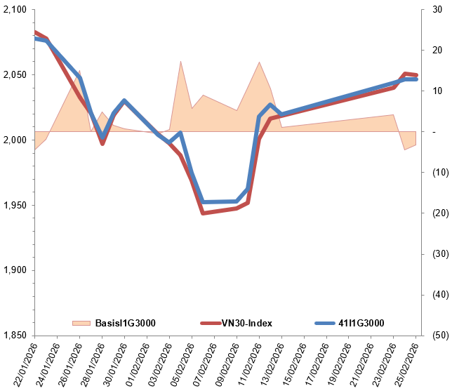 Các hợp đồng tương lai VN30 hầu hết đều tăng trong phiên giao dịch ngày 25/02/2026. Cụ thể, 41I1G3000 (I1G3000) dừng tại mốc tham chiếu, đạt 2,046.5 điểm; 41I1G4000 (I1G4000) tăng 0.17%, đạt 2,049.4 điểm; hợp đồng 41I1G6000 (I1G6000) dừng tại mốc tham chiếu, đạt 2,047 điểm; hợp đồng 41I1G9000 (I1G9000) tăng 0.26%, đạt 2,045 điểm. Chỉ số cơ sở VN30-Index kết phiên ở mức 2,049.64 điểm.