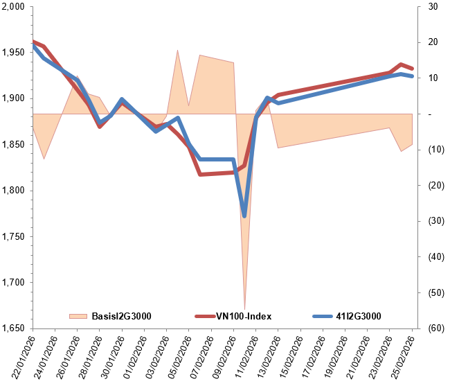 Ngoài ra, các hợp đồng tương lai VN100 hầu hết đều giảm trong phiên giao dịch ngày 25/02/2026. Cụ thể, 41I2G3000 (I2G3000) giảm 0.11%, còn 1,924.2 điểm; 41I2G4000 (I2G4000) giảm 0.52%, còn 1,932 điểm; hợp đồng 41I2G6000 (I2G6000) tăng 0.2%, đạt 1,924.1 điểm; hợp đồng 41I2G9000 (I2G9000) giảm 0.31%, còn 1,922 điểm. Chỉ số cơ sở VN100-Index kết phiên ở mức 1,932.71 điểm.