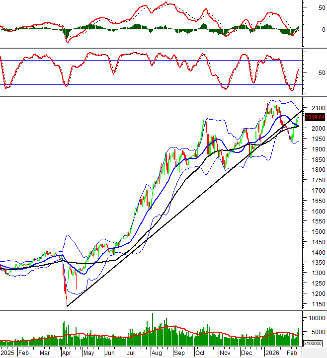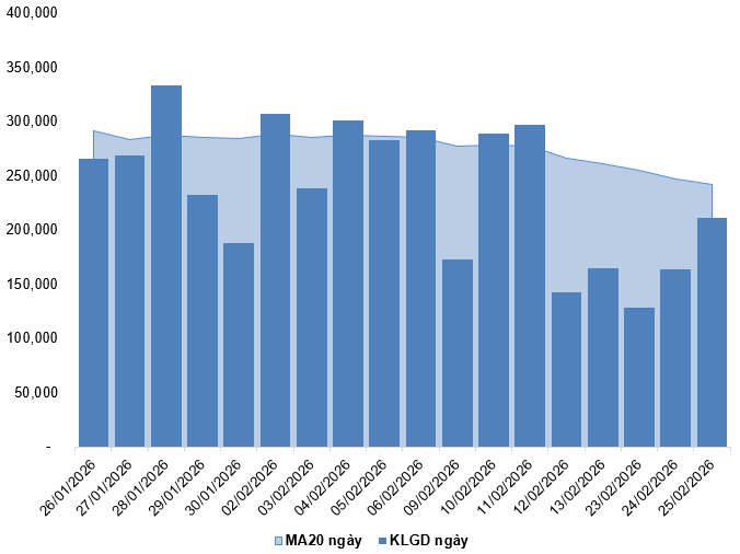 Trong phiên giao dịch ngày 25/02/2026, VN30-Index đảo chiều giảm điểm nhẹ sau khi kiểm tra lại đường trendline tăng trung hạn đã bị phá vỡ trước đó kèm theo khối lượng giao dịch có sự gia tăng và nằm trên mức trung bình 20 phiên cho thấy tâm lý khá phân vân của nhà đầu tư.