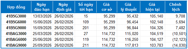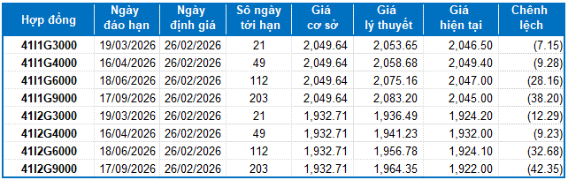 Dựa trên phương pháp định giá hợp lý với thời điểm khởi đầu ngày 26/02/2026, khung giá hợp lý của các hợp đồng tương lai đang được giao dịch trên thị trường được thể hiện như sau: