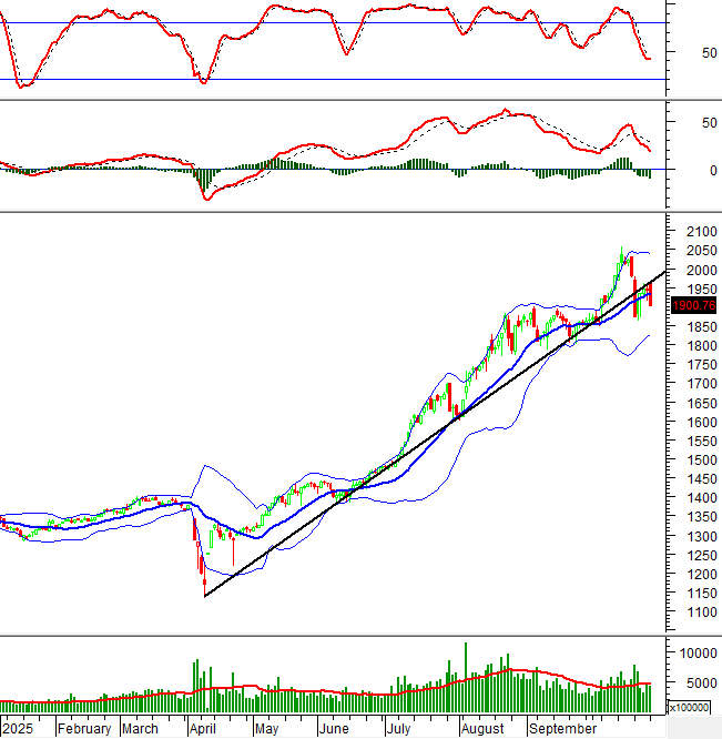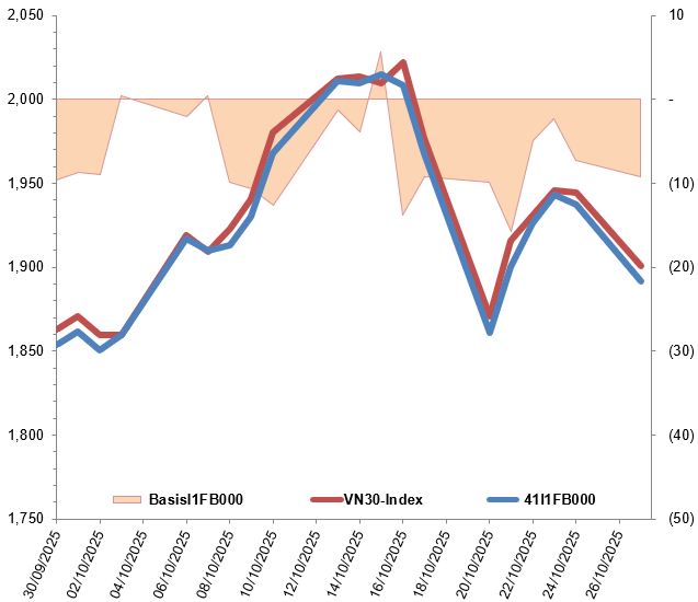 Trong phiên giao dịch ngày 27/10/2025, hợp đồng 41I1FB000 sớm bật tăng ngay từ phiên ATO nhưng bên mua dần đánh mất vị thế khi áp lực bán gia tăng trở lại khiến I1FB000 đảo chiều suy yếu. Bước sang phiên chiều, phe Long mặc dù đã hỗ trợ kéo hợp đồng này phục hồi lấy lại mốc tham chiếu nhưng bên bán vẫn có phần chiếm ưu thế hơn và một lần nữa dìm I1FB000 xuống mức thấp nhất phiên và đóng cửa tại 1,891.5 điểm, giảm 45.9 điểm.