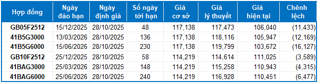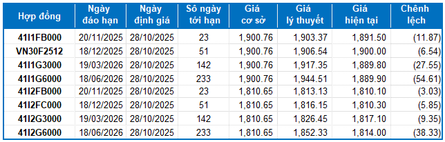 Dựa trên phương pháp định giá hợp lý với thời điểm khởi đầu ngày 28/10/2025, khung giá hợp lý của các hợp đồng tương lai đang được giao dịch trên thị trường được thể hiện như sau: