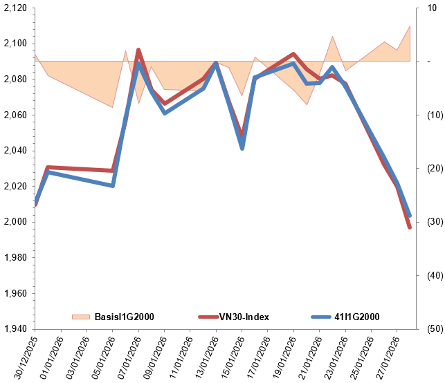 Các hợp đồng tương lai VN30 đồng loạt giảm điểm trong phiên giao dịch ngày 28/01/2026. Cụ thể, 41I1G2000 (I1G2000) giảm 0.9%, còn 2,003.8 điểm; 41I1G3000 (I1G3000) giảm 0.89%, còn 2,002 điểm; hợp đồng 41I1G6000 (I1G6000) giảm 0.73%, còn 2,005 điểm; hợp đồng 41I1G9000 (I1G9000) giảm 0.49%, còn 2,008 điểm. Chỉ số cơ sở VN30-Index kết phiên ở mức 1,997.13 điểm.