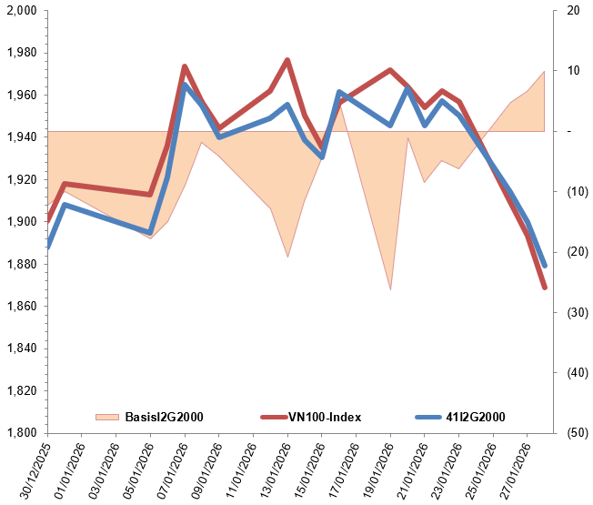 Ngoài ra, các hợp đồng tương lai VN100 đồng loạt giảm điểm trong phiên giao dịch ngày 28/01/2026. Cụ thể, 41I2G2000 (I2G2000) giảm 1.1%, còn 1,879.1 điểm; 41I2G3000 (I2G3000) giảm 1.32%, còn 1,873.8 điểm; hợp đồng 41I2G6000 (I2G6000) giảm 1.52%, còn 1,870.1 điểm; hợp đồng 41I2G9000 (I2G9000) giảm 1.27%, còn 1,876.8 điểm. Chỉ số cơ sở VN100-Index kết phiên ở mức 1,869.14 điểm.