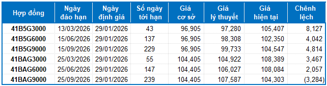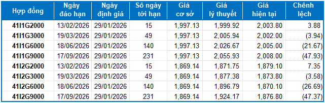 Dựa trên phương pháp định giá hợp lý với thời điểm khởi đầu ngày 29/01/2026, khung giá hợp lý của các hợp đồng tương lai đang được giao dịch trên thị trường được thể hiện như sau:
