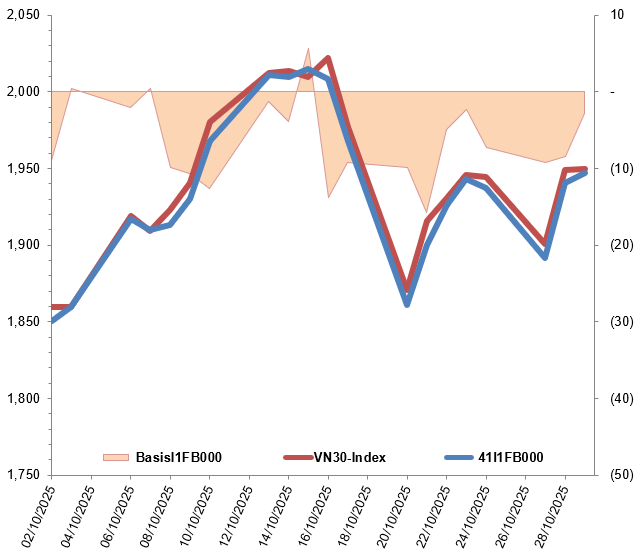 Trong phiên giao dịch ngày 29/10/2025, hợp đồng 41I1FB000 mở cửa giằng co quanh mốc tham chiếu trong nửa đầu phiên nhưng phe Long dần chiếm ưu thế hơn đã giúp cho I1FB000 tăng trong thời gian còn lại của phiên sáng. Bước sang phiên chiều, bên bán xuất hiện trở lại khiến hợp đồng này quay lại diễn biến đi ngang biên độ hẹp và áp lực bán dần tăng về cuối phiên “thổi bay” gần như mọi nỗ lực của bên mua qua đó I1FB000 đóng cửa tại mốc 1,947 điểm, tăng 6.1 điểm.