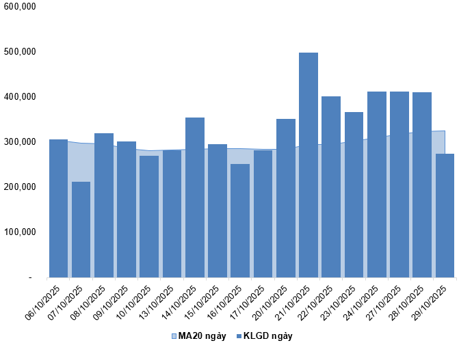 Trong phiên giao dịch ngày 29/10/2025, VN30-Index tăng điểm nhẹ đồng thời xuất hiện mẫu hình nến gần giống Doji kèm theo khối lượng giao dịch tiếp tục nằm dưới mức trung bình 20 phiên cho thấy tâm lý khá phân vân của nhà đầu tư.