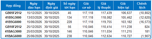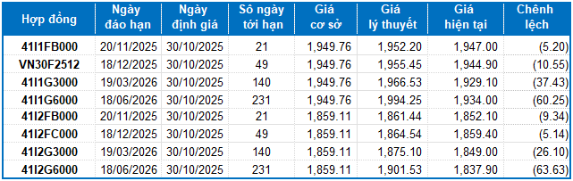 Dựa trên phương pháp định giá hợp lý với thời điểm khởi đầu ngày 30/10/2025, khung giá hợp lý của các hợp đồng tương lai đang được giao dịch trên thị trường được thể hiện như sau: