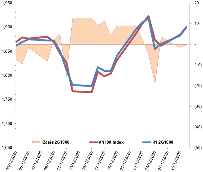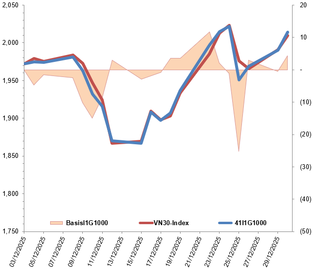 Trong phiên giao dịch ngày 30/12/2025, hợp đồng 41I1G1000 sớm bật tăng sau khi mở cửa nhưng áp lực bán xuất hiện và gia tăng khiến I1G1000 nhanh chóng đảo chiều về dưới mốc tham chiếu. Bước sang phiên chiều, bên mua quay lại và dần giành lại quyền kiểm soát giúp cho hợp đồng này tăng vọt mạnh mẽ trở lại. Qua đó, I1G1000 đóng cửa trong sắc xanh tại mốc 2,014.1 điểm, tăng 23.9 điểm.