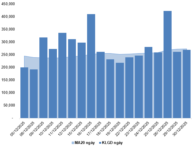 Trong phiên giao dịch ngày 30/12/2025, VN30-Index tiếp tục tăng điểm đồng thời hình thành mẫu hình nến thân nhỏ cùng khối lượng giao dịch nằm dưới mức trung bình 20 phiên cho thấy tâm lý khá phân vân của nhà đầu tư.