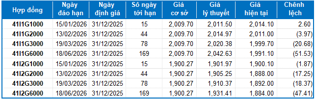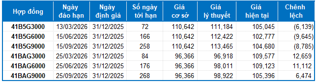 Dựa trên phương pháp định giá hợp lý với thời điểm khởi đầu ngày 31/12/2025, khung giá hợp lý của các hợp đồng tương lai đang được giao dịch trên thị trường được thể hiện như sau: