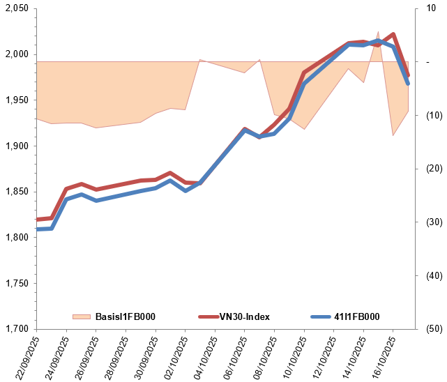 Trong tuần giao dịch 13-17/10/2025, hợp đồng 41I1FB000 mở cửa phiên đầu tuần khá thuận lợi khi lợi thế áp đảo thuộc về phe Long đã giúp cho I1FB000 tăng vọt. Tuy nhiên, trong các phiên giữa tuần sau đó, đà tăng của hợp đồng này suy yếu và chuyển sang trạng thái giằng co kéo dài. Đến phiên cuối tuần, bên bán dần nắm quyền kiểm soát khiến mọi thành quả của bên mua trong các phiên trước đó gần như bị “thổi bay” qua đó I1FB000 đóng cửa tuần tại mốc 1,968 điểm.