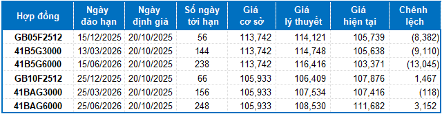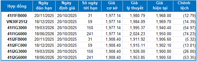 Dựa trên phương pháp định giá hợp lý với thời điểm khởi đầu ngày 20/10/2025, khung giá hợp lý của các hợp đồng tương lai đang được giao dịch trên thị trường được thể hiện như sau: