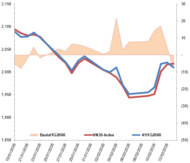 Trong tuần giao dịch 09-13/02/2026, hợp đồng 41I1G2000 bật tăng nhẹ trở lại trong những phiên đầu tuần mặc cho áp lực bán vẫn còn. Bước sang phiên giao dịch giữa tuần, phe Long giữ vị thế áp đảo giúp I1G2000 bứt phá mạnh mẽ. Tuy nhiên, ở các phiên cuối tuần sự quyết liệt của bên mua đã vơi đi cùng sự quay trở lại của bên bán khiến hợp đồng này diễn biến giằng co và đóng cửa tại mốc 2,010.5 điểm, tăng 59.2 điểm so với cuối tuần trước đó.